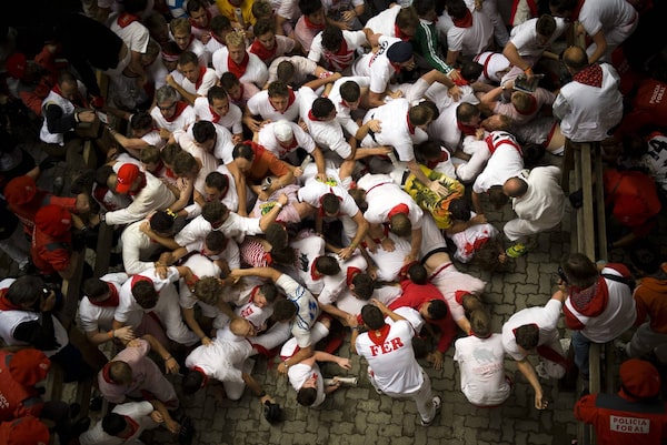 Revelers fall, blocking the street, during the running of the bulls.DANIEL OCHOA DE OLZA/The Associated Press