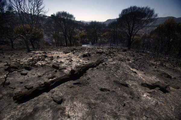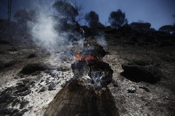 The trunk of a burnt tree lies on the ground after firemen have extinguished a fire in the outskirts of Cebreros, Spain, on Aug. 4, 2013.ANDRES KUDACKI/The Associated Press