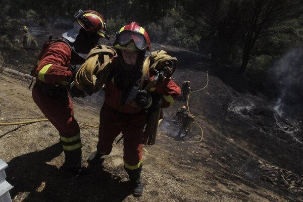 Firefighters carry fire hoses as they work in a forest fire outskirts of Cebreros, Spain, on Aug. 4, 2013.ANDRES KUDACKI/The Associated Press
