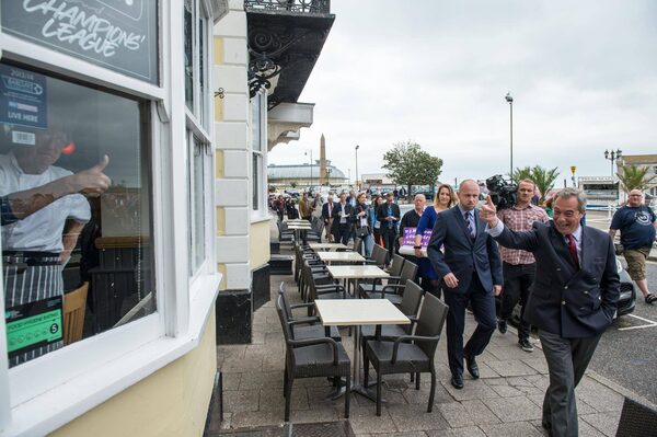 UK Independence Party Leader Nigel Farage, foreground, leads supporters on the campaign trail for Brexit in Ramsgate, England, on June 13. In Thanet, the coastal district that includes Ramsgate, 64 per cent voted Leave, one of the highest figures nationwide.<252>AFP / Getty Images