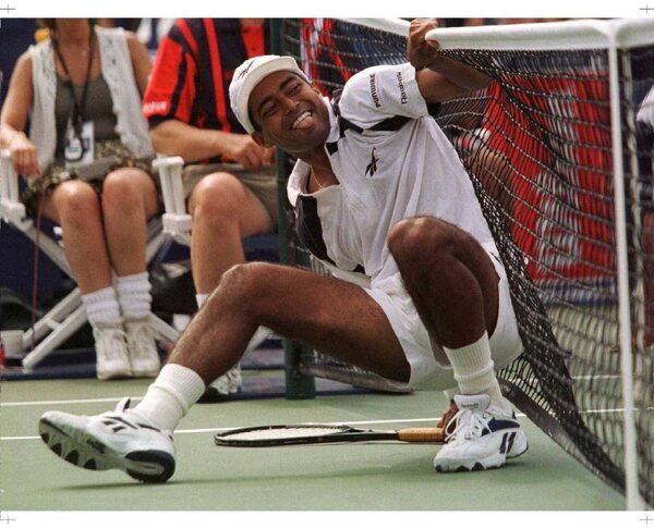 Leander Paes of India stumbles into the net during his 6-3, 4-6, 1-6, 0-6, second round loss to Andre Agassi of the United States, at the U.S. Open.BLAKE SELL/Reuters