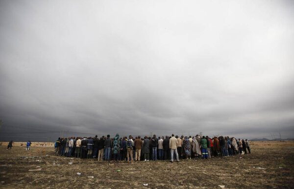 Striking mineworkers attend a ‘report back’ meeting near Lonmin’s Marikana mine in South Africa's North West Province, Sept. 6, 2012. If South Africa’s gold miners strike over wages next week, the loss of output will drag down companies already being crushed between rising costs and falling prices for the metal.MIKE HUTCHINGS/Reuters