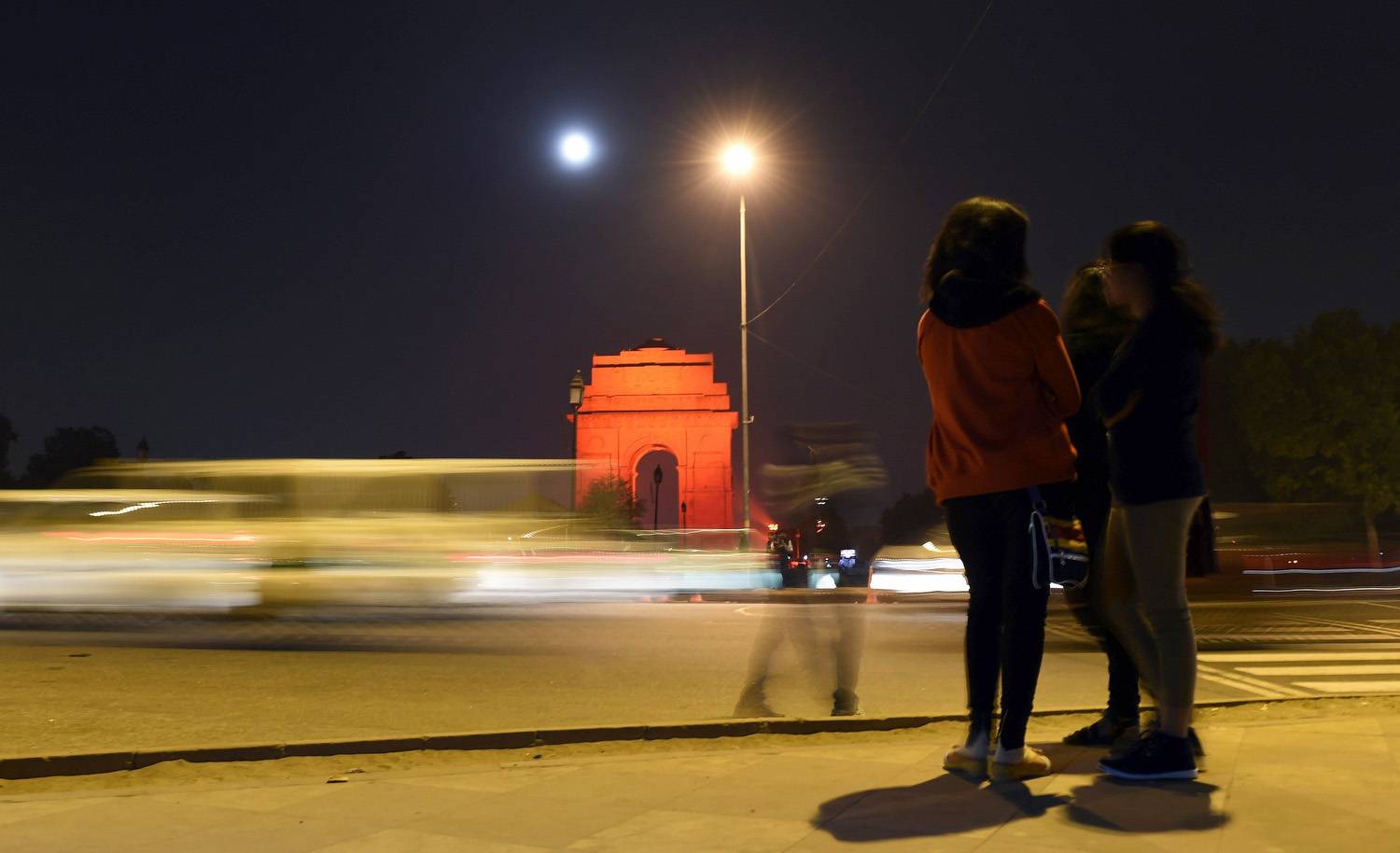 Young Indian women look on as orange lighting illuminates The India Gate Monument in New Delhi on the occasion of The International Day for the Elimination of Violence Against Women.Money Sharma/AFP / Getty Images