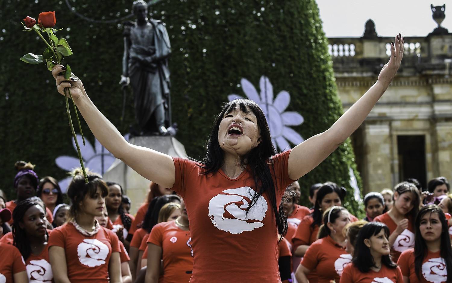 Colombian Patricia Espitia (C), victim of an attack with acid, takes part in a performance during the International Day for the Elimination of Violence against Women in Bogota.Luis Acosta/AFP / Getty Images