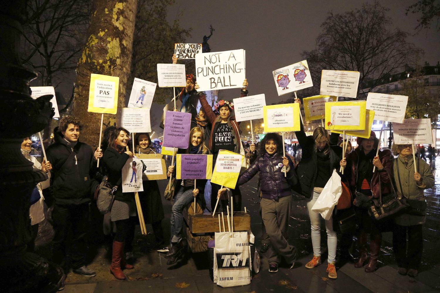 Women hold placards as they demonstrate at the Place de la Republique in Paris to mark the International Day for the Elimination of Violence Against Women.Francois Guillot/AFP / Getty Images