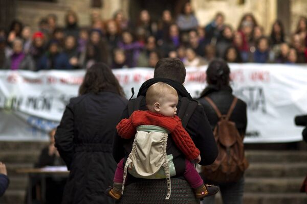 A woman carrying her baby watch as others demonstrate against domestic violence in Barcelona, Spain.Emilio Morenatti/The Associated Press