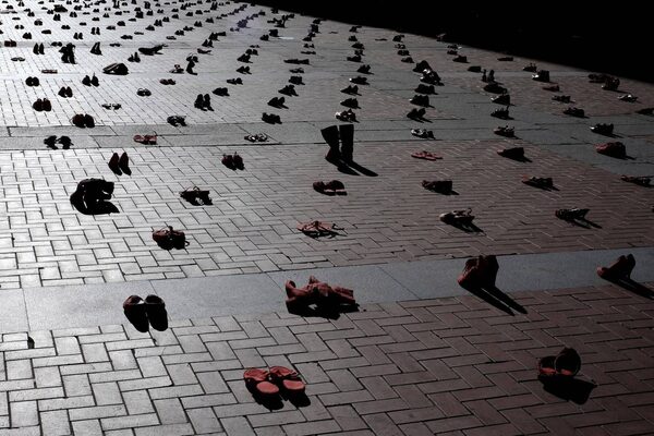 Red shoes are seen placed at Plaza Mayor, as part of an installation to protest against gender violence and femicide, in Valladolid, Spain.Juan Medina/Reuters