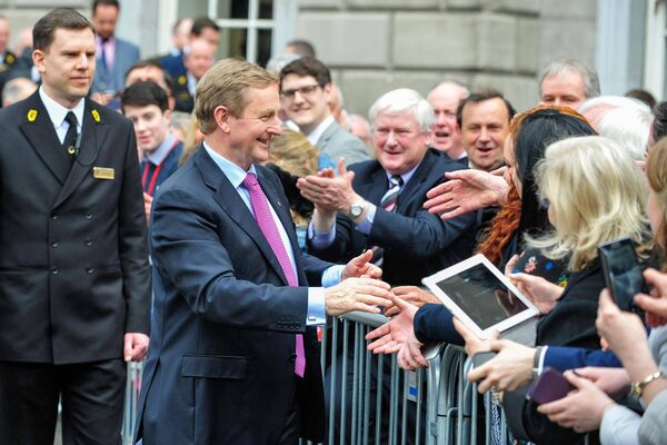 Enda Kenny, Ireland's prime minister and leader of Fine Gael, center left, greets well-wishers outside the Irish Parliament in Dublin, Ireland, on Friday, May 6, 2016.Aidan Crawley/Bloomberg