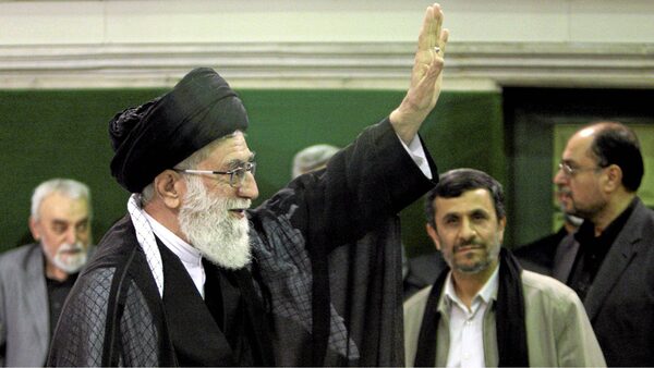 Iranian supreme leader Ayatollah Ali Khamenei, left, waves to his well wishers, unseen, as President Mahmoud Ahmadinejad, second right, looks on, in a religious ceremony, in Tehran, Iran on Saturday, May 7, 2011.STR/The Associated Press