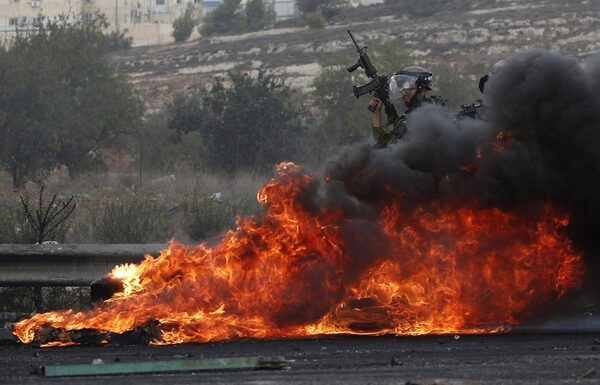 Israeli security forces stand behind burning tires during clashes with Palestinians in Beit El, near the West Bank city of Ramallah, on Friday. The leader in the Gaza Strip of the Islamist group Hamas, Ismail Haniyeh, dubbed unrest shaking Israel, occupied east Jerusalem and the West Bank as a new intifada, or uprising, and urged Palestinians on to further confrontation.ABBAS MOMANI/AFP / Getty Images