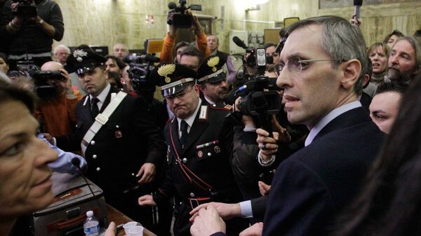 Silvio Berlusconi lawyer Niccolo' Ghedini, reacts after the verdict for the case where the former Italian Prime Minister Silvio Berlusconi stands accused of bribing British lawyer David Mills in Milan, Italy, Saturday, Feb. 25, 2012. The court has ruled that the statute of limitations has run out in a corruption case against Silvio Berlusconi, handing Italy's former prime minister another victory in a long string of judicial woes he has faced.Luca Bruno/AP