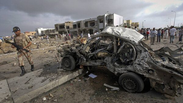A paramilitary soldier walks past the site of a suicide bomb attack in Karachi on Sept. 19, 2011.