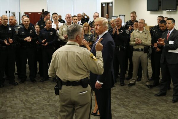 U.S. President Donald Trump speaks with first responders at the Las Vegas Metropolitan Police Department on Oct. 4, 2017.Kevin Lamarque/Reuters