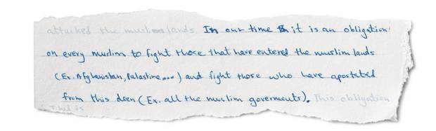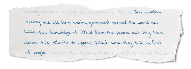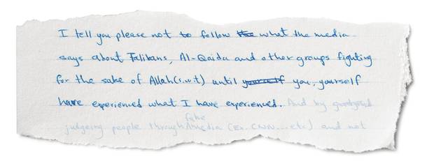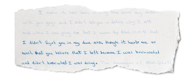 The second important element of the letter, one which is a fairly common theme when such individuals call or write home to their families, is Mr. Yar's genuine attempt to communicate why he made the choice. A lot of family members of jihadis whom I have interviewed over the years believe that their children were brainwashed by religious leaders or close friends. They insist that they could get their children to "snap out of it" if given some time to talk with them.