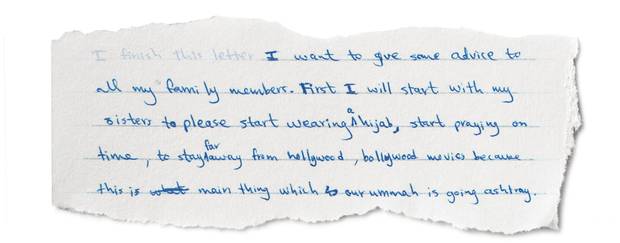 The next letter is different, a nine-page missive that is alternately hectoring and affectionate. In it, the former University of Manitoba student urges his family to leave Canada, a "filthy place" where the media tells nothing but lies about "Talibans, al-Qaeda and other groups fighting for the sake of Allah." He proceeds to give instructions to each relative: start wearing hijabs, stop watching Hollywood movies, begin praying, keep your children out of public school.