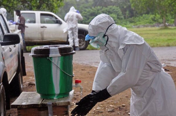 A health worker washes with disinfectant after dealing with people suspected of having the Ebola virus in the city of Monrovia, Liberia on Aug. 16.Abbas Dulleh/The Associated Press