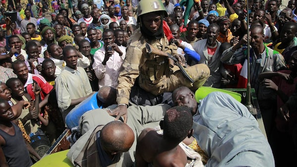 A Malian soldier pushes suspected Islamist extremists to lay in the back of the army truck in Gao, northern Mali, Tuesday Jan. 29, 2013. Four suspects were arrested after being found by a youth militia calling themselves the "Gao Patrolmen". Malian soldiers prevented the mob from lynching them. (AP Photo/Jerome Delay