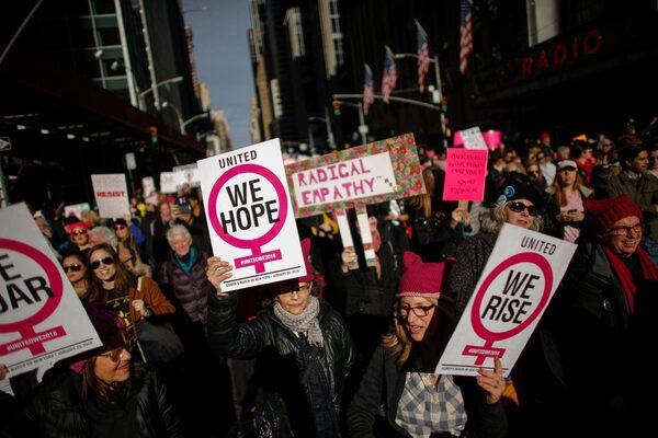 Women took to the streets in New York and across the United States on Saturday in a remarkable show of opposition to a sitting president exactly one year after his inauguration. The protests were less large than a year ago but no less intense, propelled by the administration's policies and a nationwide reckoning over sexual assault and harassment.