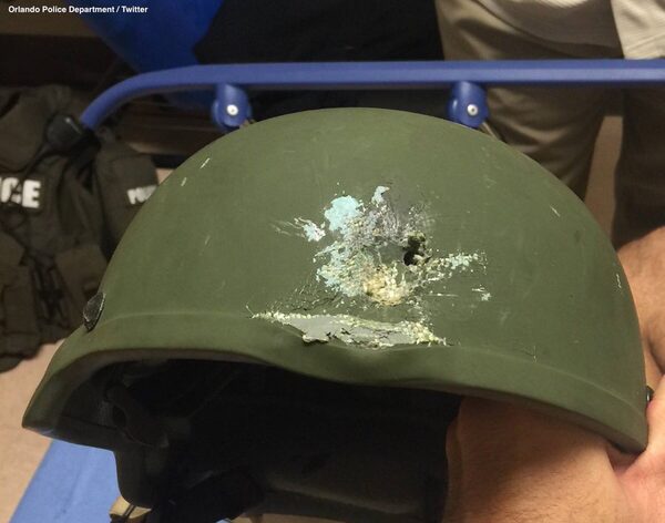 In hail of gunfire in which suspect was killed, an OPD officer was hit. Kevlar helmet saved his life.