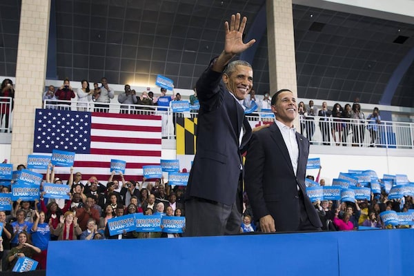 President Barack Obama, left, stands with Maryland gubernatorial candidate Anthony Brown during a campaign rally at Wise High School, on Sunday, Oct. 19, 2014, in Upper Marlboro, Md.Evan Vucci/The Associated Press