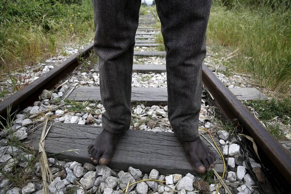 Azam, 26-year-old +from South Sudan stands on rail tracks after failing to flee to Italy in the western Greek town of Patras .Yannis Behrakis/Reuters