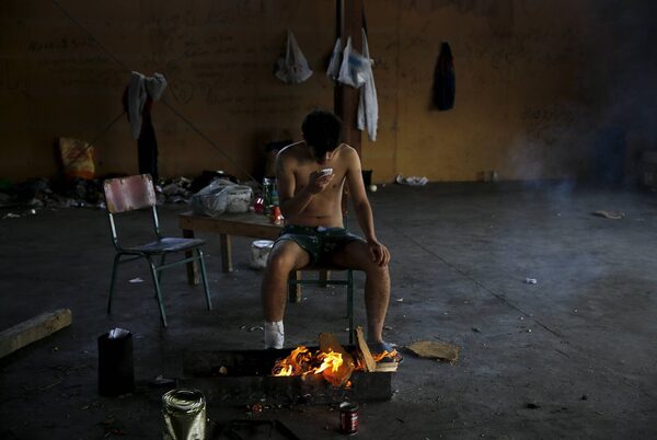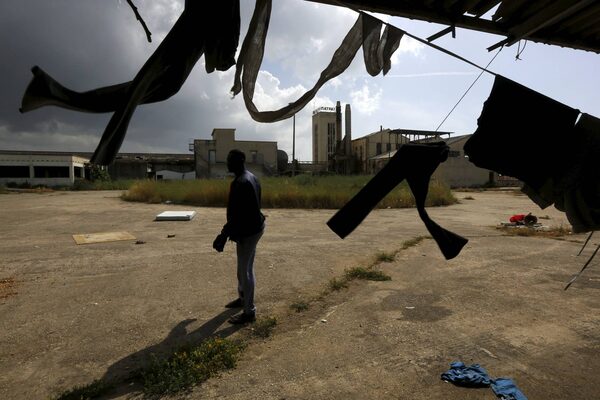A Sudanese immigrant stands next to clothes that are hanging out to dry inside a deserted textile factory in the western Greek town of Patras.Yannis Behrakis/Reuters