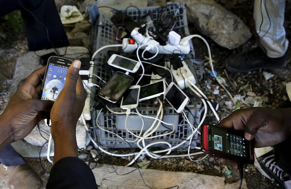 Sudanese immigrants charge their mobile phones at a make-shift electric outlet in the western Greek town of Patras.Yannis Behrakis/Reuters
