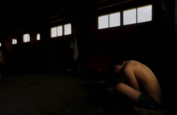 An Afghan immigrant is sits inside a wood factory across the street from the ferry terminal in the western Greek town of Patras.Yannis Behrakis/Reuters