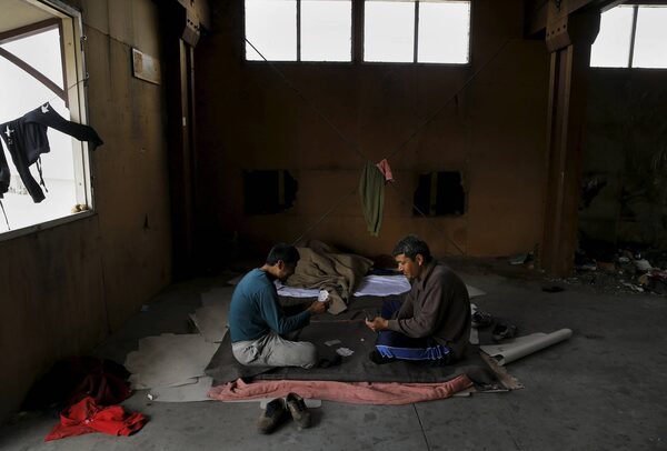 Afghan immigrants play cards inside a wood factory across the street from a ferry terminal in the western Greek town of Patras.Yannis Behrakis/Reuters