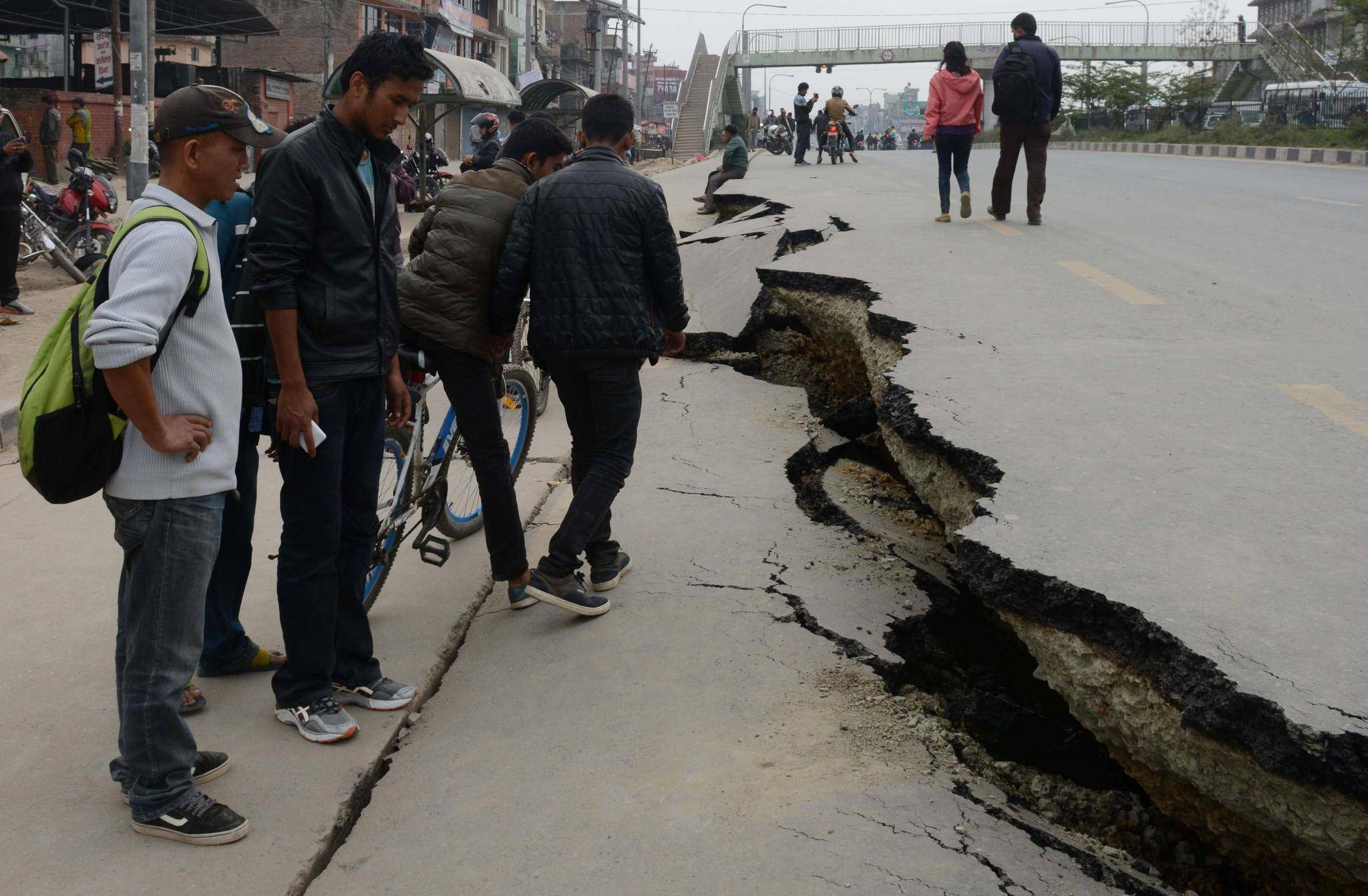 Nepalese residents walk past road damage following an earthquake in Kathmandu on April 26, 2015. Prakash Mathema, AFP/Getty Images.