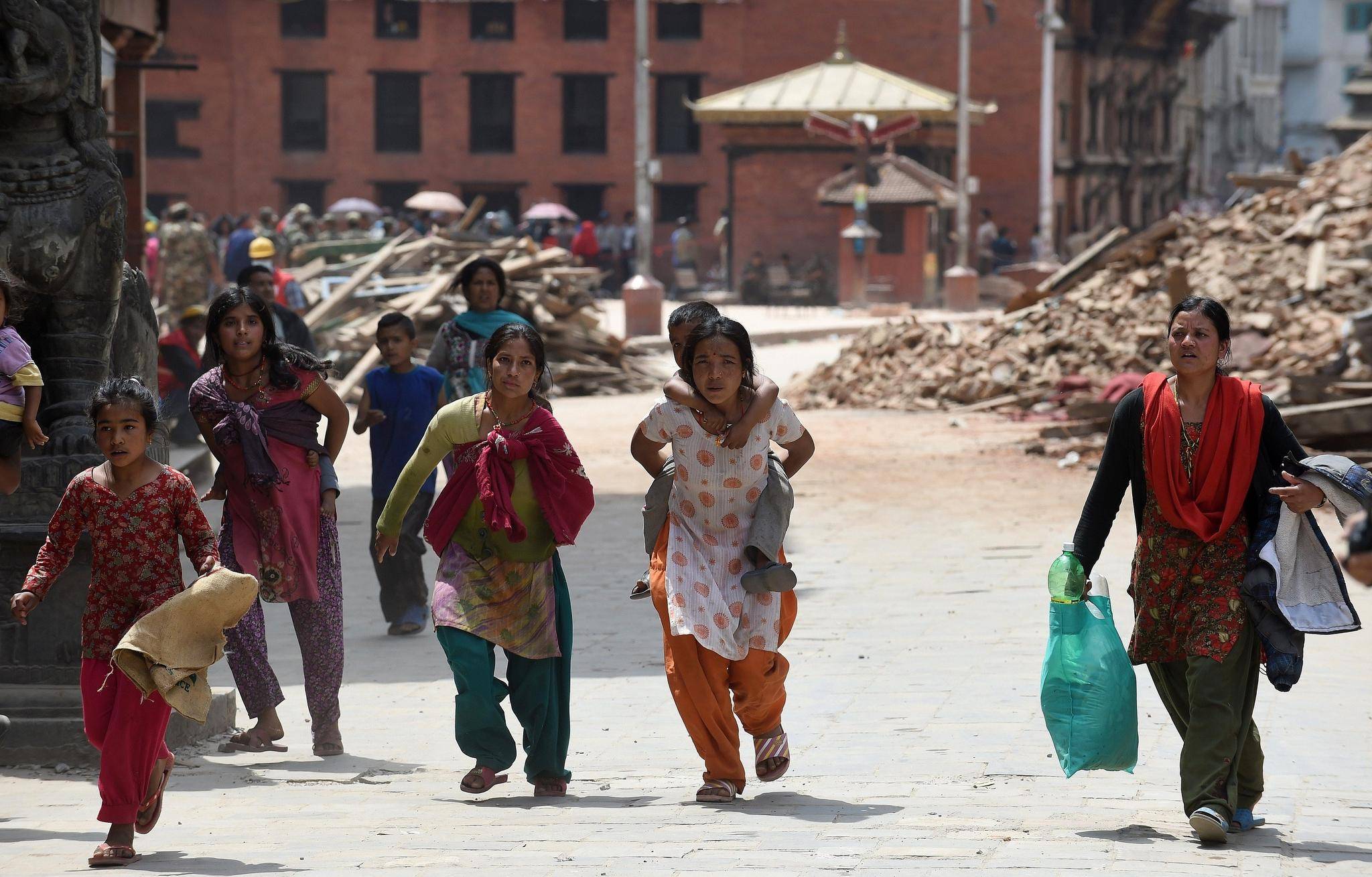 Nepalese residents carry belongings following fresh tremors in Kathmandu on April 26, 2015. Prakash Singh, AFP/Getty Images.