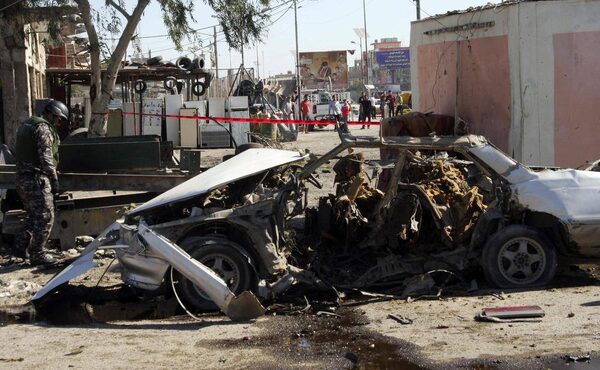 A police officer stands guard at the site of car bomb attack in Baghdad's Sadr City, March 19, 2013.Qahtan al-Sudani/Reuters