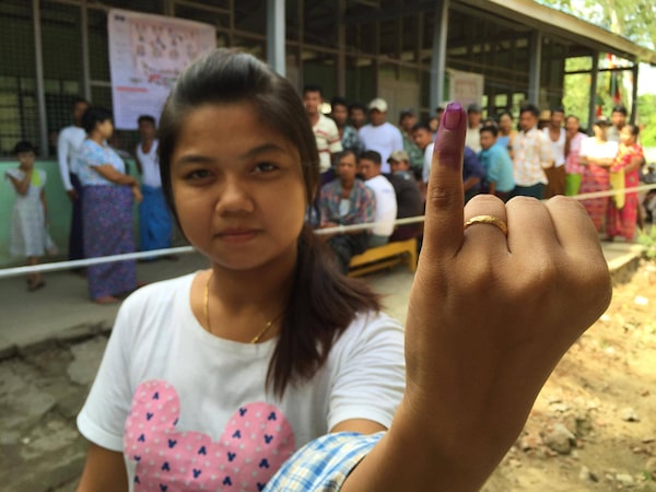 A woman in Myanmar holds up her ink-stained finger to show she voted in the country’s historic election on Sunday, Nov. 8, 2015Nathan VanderKlippe/The Globe and Mail