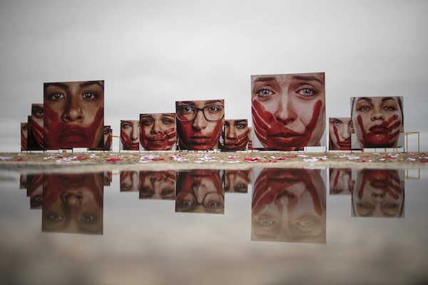 Marcio Freitas’ photos of models portraying the anguish suffered by abused women, and 420 pairs of underwear, appear on Copacabana beach in Rio de Janeiro, Brazil, on June 6, 2016.Felipe Dana/The Associated Press
