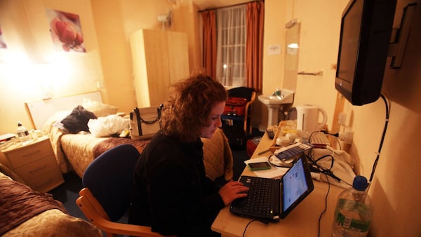 Canadian Janay Nugent works on her computer in her London hotel room.Randy Quan