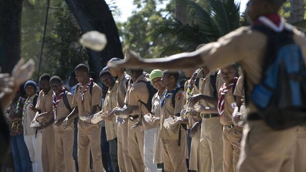 Rickety shelters made from sticks and blankets are popping up everywhere - in parks, on boulevards and in farm fields. In Leogane, a Scout troop was busy clearing debris yesterday to make way for a portable water reservoir. The 40 boys and girls were decked out in full uniform complete with Scout scarves.