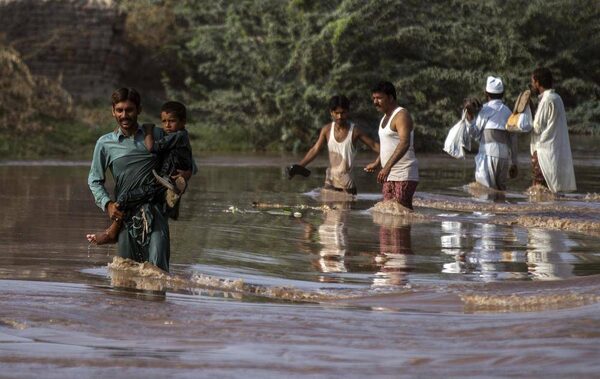 Flood victims wade through a flooded field from their houses following heavy rain in Jhang, Punjab province, September 11, 2014.ZOHRA BENSEMRA/Reuters