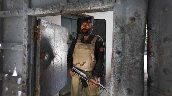 A police officer stands guard May 8, 2011, at the gates of Abbottabad's central police station, where officials announced recently that foreign guests cannot stay in hotels without written permission and should remain off the streets at night.