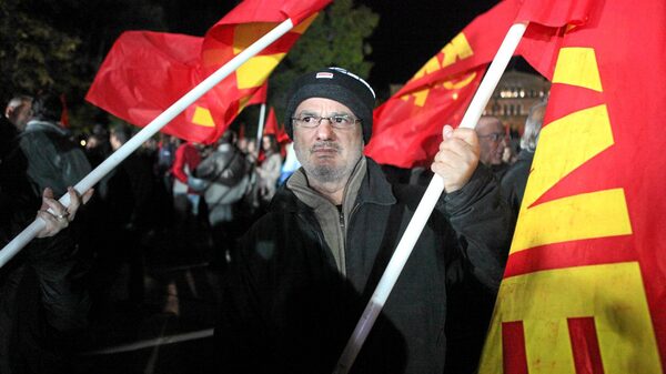 Yanis Tsakalos, 51, carries a Communist flag at a rally in front of the Greek Parliament on Friday night. His wife lost her job as a sales clerk five days ago, he said, and his own work as a street sweeper seems increasingly at risk because of downsizing by the municipal government. His salary has been cut in half in the last two years, he said, and he can no longer afford to buy fuel for the central heating system in their home. "We get under a pile of blankets and use the fireplace," he said.Graeme Smith