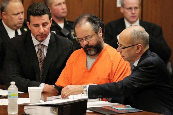 Ariel Castro (C), 53, sits as his attorneys Craig Weintraub (L) and Jaye Schlachet (R) review documents during Castro's sentencing on kidnapping, rape and murder charges in Cleveland, Ohio August 1, 2013.AARON JOSEFCZYK/Reuters