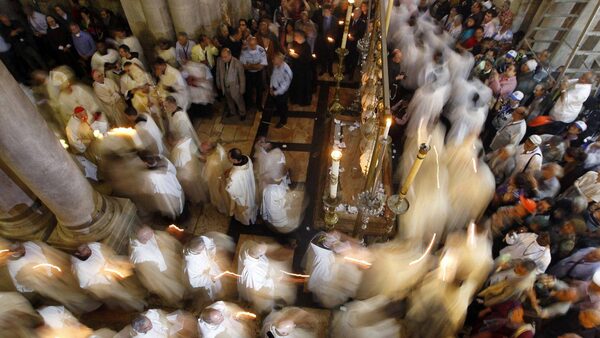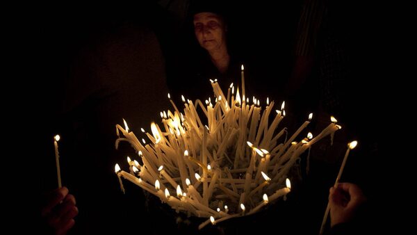 A Christian worshipper lights candles inside the Church of the Holy Sepulchre, traditionally believed to be the burial site of Jesus Christ, in Jerusalem's Old City, Sunday, April 8, 2012.Sebastian Scheiner/AP