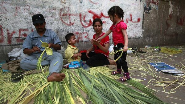 A Coptic Christian family prepares palm frond decorations during Easter in front of a church in Cairo April 8, 2012.ASMAA WAGUIH/Reuters