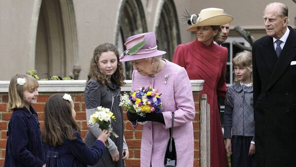 Queen Elizabeth II, center, receives flowers as she leaves St George's Chapel in Windsor Castle while her husband Prince Philip, right, daughter-in-law, Sophie, the Countess of Wessex, fourth right, Prince Edward, third right partially hidden, and grand-daughter Lady Louise Windsor look on, after attending an Easter Matins Service, Windsor, England, Sunday, April 8, 2012.Sang Tang/Reuters