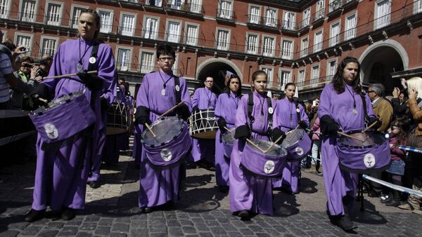 Members of 'Jesus Atado a la Columna' confraternity play drums during the traditional 'Tamborrada', celebrating Holy Week Resurrection Day, at Mayor Square in Madrid, Spain, Sunday, April 8, 2012. Hundreds of processions take place throughout Spain during the Easter Holy Week.Alberto Di Lolli/AP