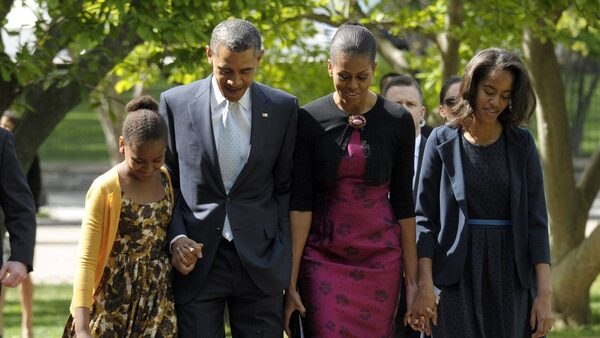 President Barack Obama, first lady Michelle Obama, daughters Malia, right, and Sasha walk across the square from the White House to St. John's Episcopal Church for an Easter service in Washington Sunday, April 8, 2012.Susan Walsh/AP