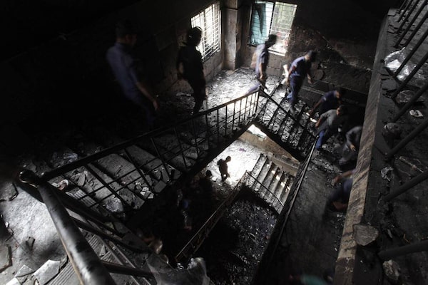 A Bangladeshi police official inspects the burnt garment factory in the Savar neighborhood outside Dhaka, Bangladesh, Nov. 25, 2012. At least 112 people were killed in a late Saturday night fire that raced through the multi-story garment factory just outside of Bangladesh's capital, an official said Sunday.Khurshed Rinku/The Associated Press