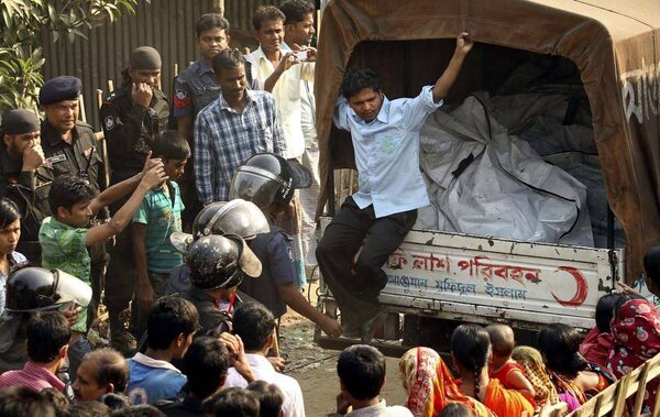 Relatives and onlooker surround a truck carrying the bodies of their kin killed in a fire at a garment factory outside Dhaka, Bangladesh, Sunday, Nov. 25, 2012. At least 112 people were killed in a late Saturday night fire that raced through the multi-story garment factory just outside of Bangladesh's capital, an official said Sunday.Jibon Amir/The Associated Press