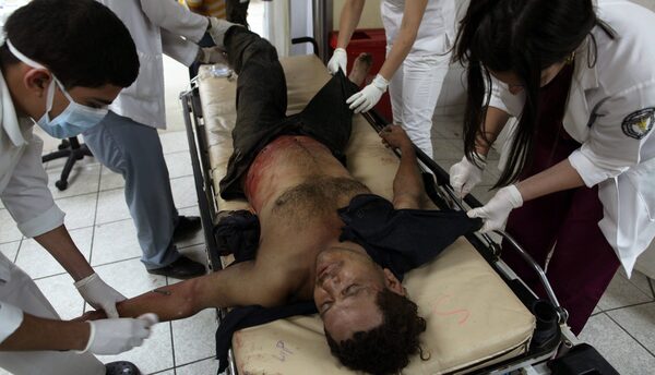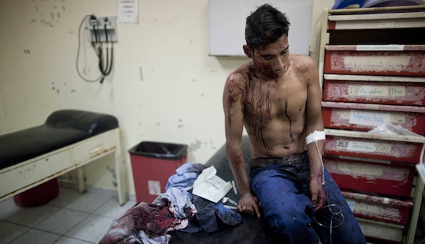 A man who was injured during a shooting at a pool hall gets emergency medical attention from doctors and nurses at the Catalino Rivas Public Hospital in San Pedro Sula, Honduras March 11, 2012. San Pedro Sula, often cited as Honduras’ most violent city, with a murder rate almost double the national average.Esteban Felix/AP Photo