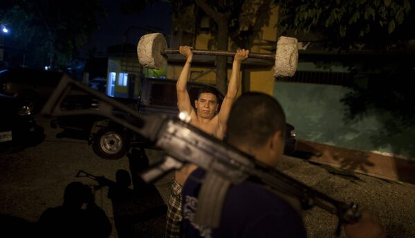 A police officer lifts weights made with concrete at a police station in San Pedro Sula, Honduras March 8, 2012.Esteban Felix/AP Photo