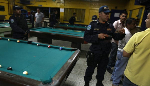 Police inspect people's ID's at a pool hall as they patrol in San Pedro Sula, Honduras, March 8, 2012.Esteban Felix/AP Photo